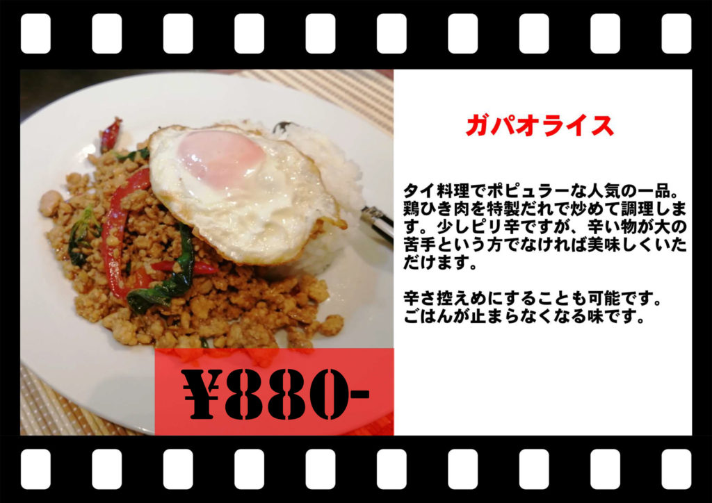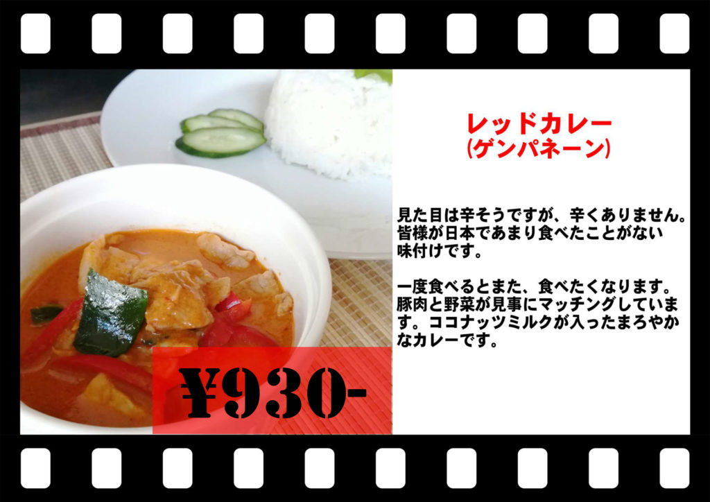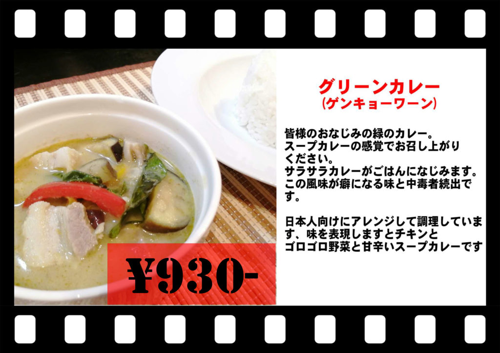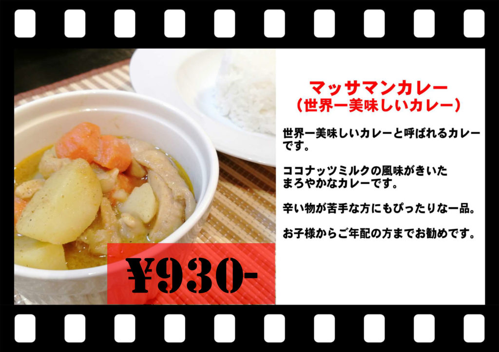 (カオマンガイ / グリーンカレー / レッドカレー / マッサマンカレー / パッポンカレー
